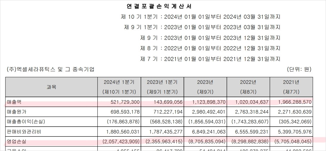 💣 그런데 어차피 영업이익 적자임. 이 적자규모가 줄어들지 않고 있어서 문제임. 2021년부터 2024년 1분기까지 적자규모가 그대로 이어지고 있음. 어떻게 하려고 그러지?(나중에 유상증자...?)