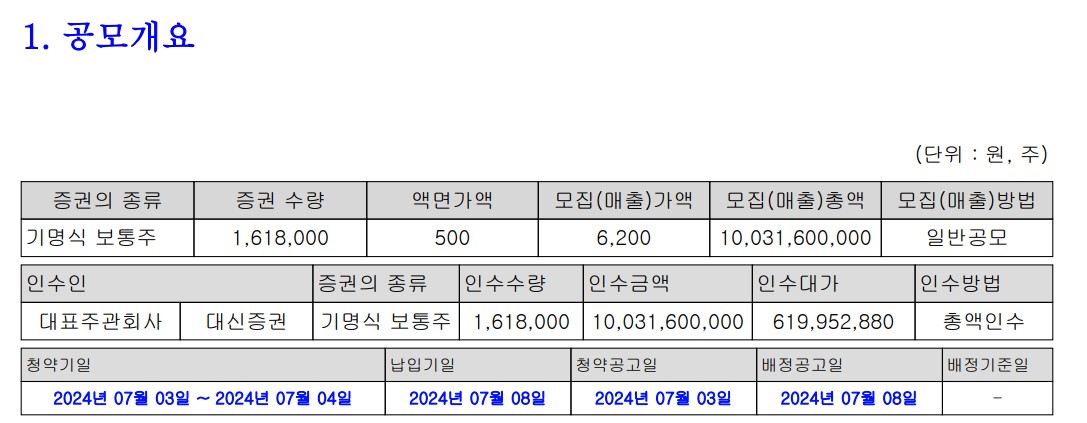 엑셀세라퓨틱스의 이번 공모는 1,618,000주의 신주 모집으로 구성되어 있음. 공모 주식은 전량 일반공모로 배정되며, 청약은 2024년 7월 3일부터 4일까지 진행됨. 공모 주관사는 대신증권임. 공모가는 수요 예측 결과에 따라 결정되며, 상장 주관사와 협의 후 최종 확정될 예정임. 수요 예측은 2024년 6월 24일부터 6월 28일까지 실시됨. 공모금액은 회사의 연구개발 및 운영 자금으로 사용될 예정임.