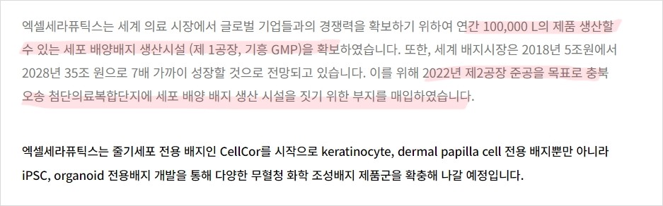 엑셀세라퓨틱스는 생명공학 분야에서 세포유전자치료제(CGT) 개발 및 상업화를 목표로 하는 기업임. 엑셀세라퓨틱 스는 세포치료제와 유전자치료제 분야에서 독보적인 기술력을 보유하고 있음. 주요 제품으로는 희귀난치성 질환 치료를 위한 세포유전자치료제가 있으며, 이 제품들은 높은 치료 효능과 안전성을 제공함. 회사는 또한 지속적인 연구개발을 통해 새로운 치료제를 개발하고 있음. 이러한 기술력과 혁신은 엑셀세라퓨틱스를 바이오 의약품 시장에서 경쟁력 있는 위치로 이끌고 있음.