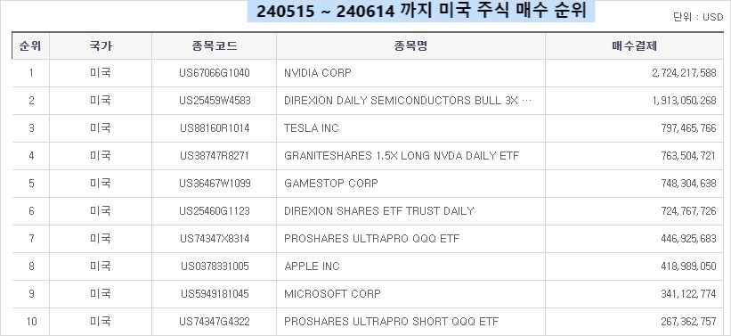 한 달간 매수금액을 보면 SOXL... ㅋㅋㅋㅋ 매수금액이 2위고 1위가 엔비디아임. 3위는 테슬라. 여전히 한국 형님들의 심장은 터질 줄 모르고 펌프질중. 언제까지 오를까?