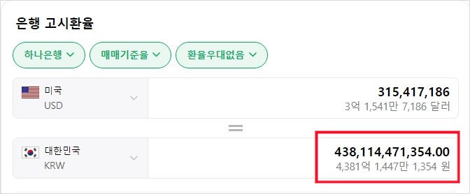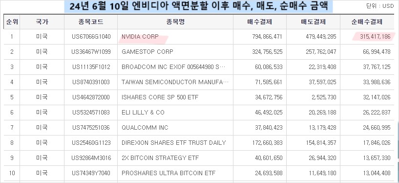 24년 6월 10일부터 6월 15일까지 엔비디아 주식 매수 금액임. 매수 - 매도인 순매수결제액만 315417186달러고 이게 우리돈으로 얼마냐?