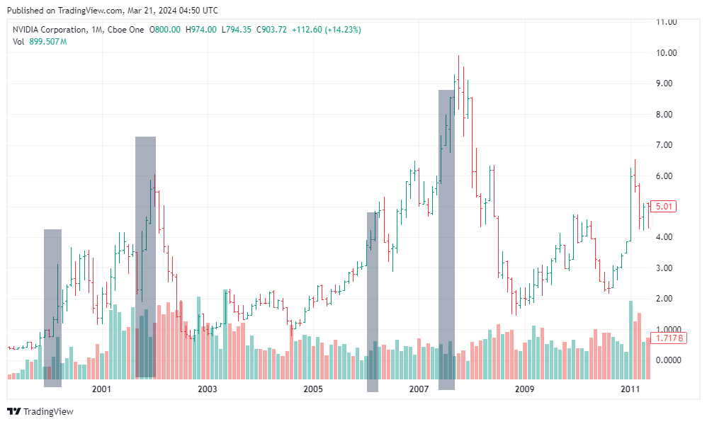 단, 조심해야 할 것은 과거 사례입니다. 엔비디아는 과거 여러차례 주식 분할을 해왔는데요 그 때마다 급등 후 하락 패턴을 보였습니다.