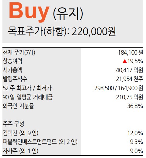 엔씨소프트의 목표주가는 220,000원으로 설정됨. 이는 2024년 하반기 신작 출시와 함께 실적 개선이 기대되는 점을 반영한 것임. 현재 주가는 저평가된 상태로, 신작의 흥행 여부에 따라 큰 폭으로 상승할 가능성이 있는데, 흥행을 못함.