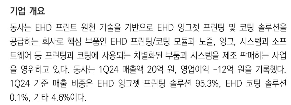 엔젯은 고속 전사 프린터 및 잉크젯 프린터용 잉크를 주력으로 하여 일본과 유럽 시장에서 높은 점유율을 보유한 기업임. 2023년 매출액은 520억 원, 영업이익은 80억 원을 기록하였으며, 전사 영업이익률은 15.4%로 안정적인 수익성을 보임. 특히, 일본과 유럽 시장에서의 신규 계약으로 기술력과 시장 점유율이 강화되고 있음.