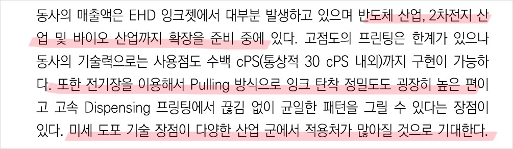 • 기술적 분석: 고속 전사 프린터 및 잉크젯 프린터용 잉크의 기술력과 품질 로 경쟁력 보유.