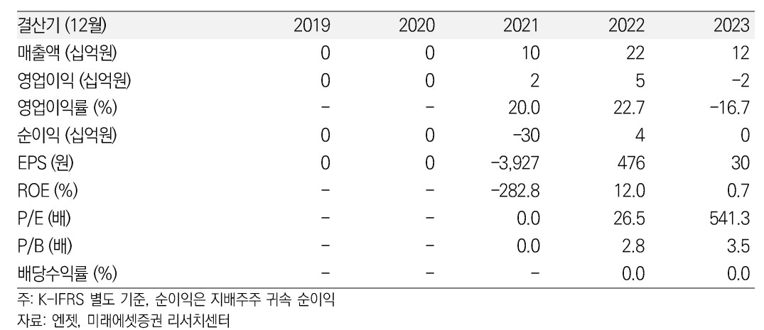 엔젯은 2023년 매출액 520억 원, 영업이익 80억 원을 기록하였음. 영업이익률은 15.4%로 안정적인 수익성을 유지하고 있으며, 순이익은 60억 원임. 부채비율은 40.3%로 안정적인 수준을 유지하고 있으며, PER은 13.5배로 적정 수준임. 아래 표는 2021년부터 2024년 1분기까지의 주요 재무 지표를 나타냄.