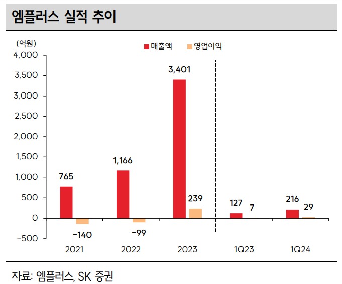 A. 엠플러스는 2023년 매출액 3,401억 원, 영업이익 239억 원을 기록하며 흑자 전환에 성공함.