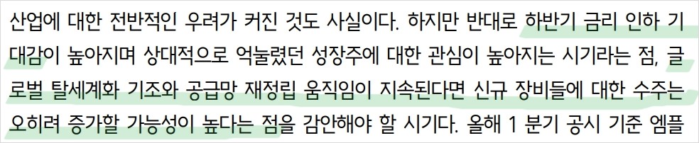 엠플러스는 최근 차세대 전지 생산 장비 협업을 통해 새로운 성장 모멘텀을 마련하고 있음. 2023년 1분기 공시 기준 수주 잔고는 3천억 원으로 안정적인 실적을 유지하고 있음. 미국, 유럽, 중국 시장에서의 수주 증가와 전극 공정으로의 사업 영역 확장은 긍정적인 요인임. 또한, 하반기 금리 인하 기대감과 글로벌 탈세계화 기조가 엠플러스의 장비 수요를 증가시킬 가능성이 있음. 엠플러스는 차세대 전지 생산 장비의 연내 납품을 목표로 하고 있음, 이는 향후 성장 가능성을 높이는 중요한 요소가 될 것임.