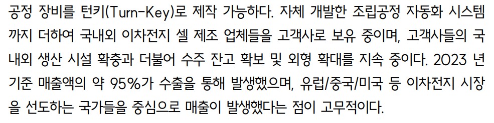 엠플러스는 이차전지 조립 공정 장비를 주력으로 생산/판매하는 기업으로, 파우치형 및 각형 이차전지의 조립공정 장비를 제공함. 2023년 매출액은 3,401억 원으로 전년 대비 191.6% 증가했으며, 영업이익은 239억 원을 기록해 흑자 전환에 성공함. 특히, 엠플러스의 매출액의 95%가 수출을 통해 발생했으며, 주요 시장은 유럽, 중국, 미국임. 2023년 1분기 기준 수주 잔고는 3천억 원으로, 이는 엠플러스의 실적 안정성을 높이는 중요한 요소임.
