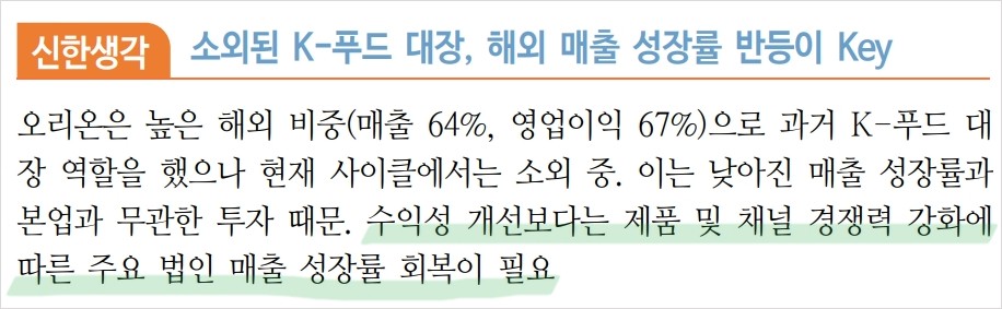 오리온은 원래 식품 대장주였는데 왜 이렇게 되었을까? 남들이 다 해외를 바라볼 때 오리온은 너무 안주해 있었음. 이 대가를 지금 받고 있다고 봄. 현실에 안주하여 보수적인 경영을 하는게 장점이었는데 지금은 단점이 된 격. 어쩔 수 없지 뭐. 이게 또 오리온의 매력인걸. 본 글은 투자 권유글이 아님. 증권사 리포트를 바탕으로 작성됨.