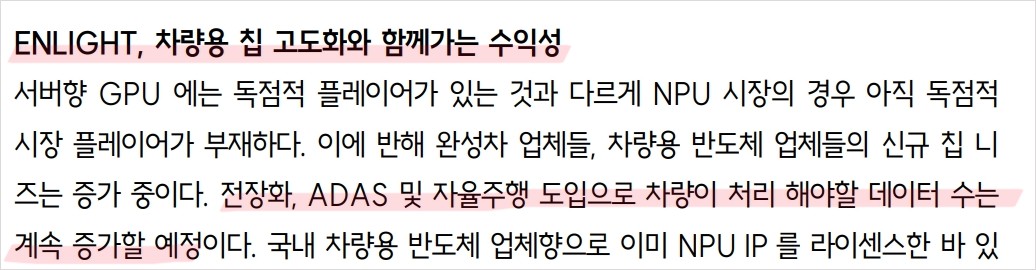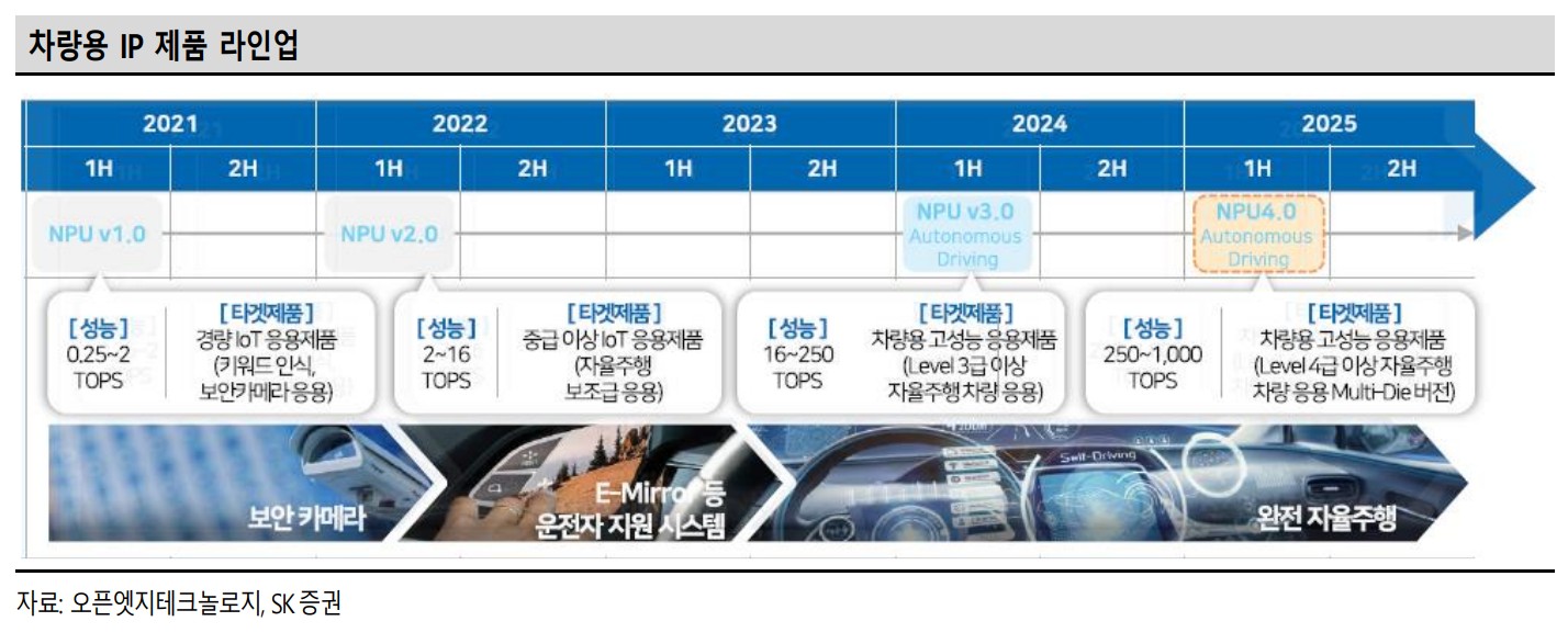 오픈엣지테크놀로지는 최근 세미파이브와 HPC 향 LPDDR6 플랫폼 MOU를 체결하며, 차세대 메모리 IP 투자에 박차를 가하고 있음. 또한, 차량용 반도체 업체와의 협력을 통해 NPU IP를 라이선스하여 매출 성장을 기대하고 있음. 2024년에는 250TOPS 성능의 ENLIGHT 3.0 모델 출시를 통해 매출 확대가 예상됨. 차세대 메모리 IP와 차량용 NPU에서 성과 기대. 세미파이브와의 협력으로 성장 동력 확보.