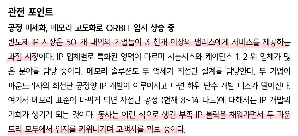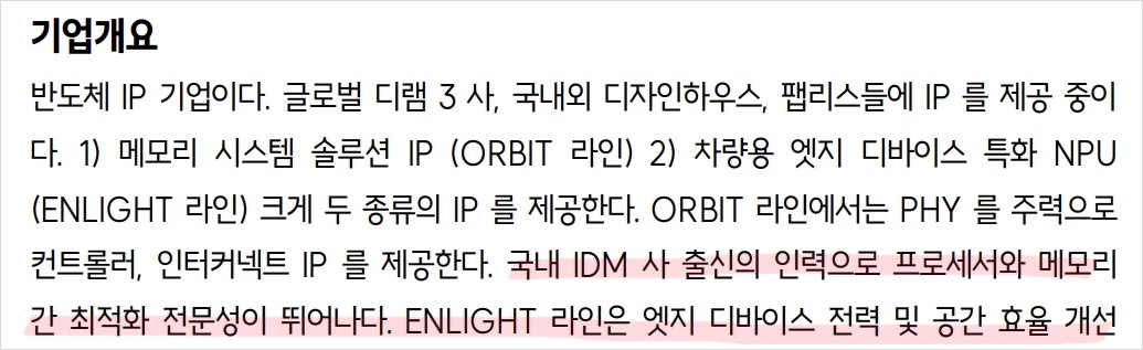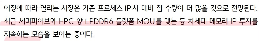 이 회사는 글로벌 디램 3사, 국내외 디자인하우스, 팹리스들에 IP를 제공하고 있으며, 특히 메모리 시스템 솔루션 IP 분야에서 강점을 보임. 2024년 예상 매출액은 196억 원, 영업이익은 -159억 원으로, 적자가 지속될 것으로 전망됨. 그러나 장기적으로는 메모리 고도화와 차량용 칩 수요 증가에 따른 성장이 기대됨. 흑자전환만 제발;;;