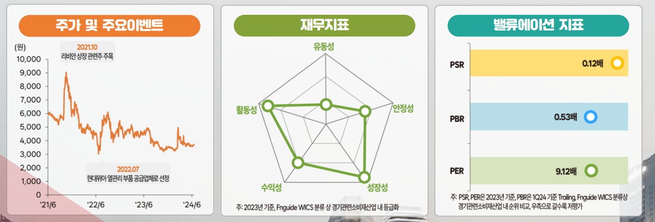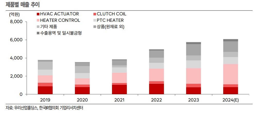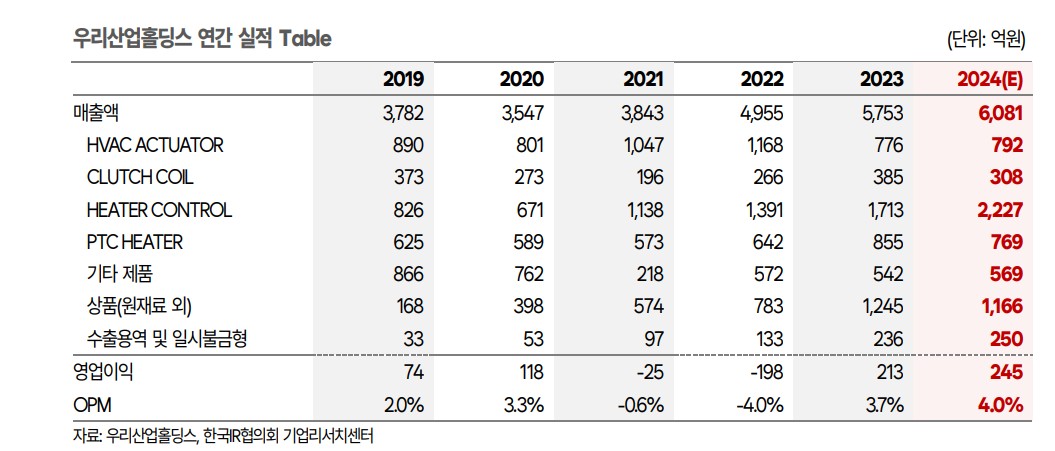 우리산업홀딩스는 2023년 역대 최대 실적을 기록하며 안정적인 성장세를 보였음. HVAC Actuator, Clutch Coil, Heater Control 등 주요 제품군의 매출 증가와 전기차 시장 성장으로 PTC 히터 판매가 확대되며 호실적을 견인했음. 2024년에는 미국 조지아주 생산법인의 신규 매출이 본격화되며 글로벌 전기차 시장에서의 입지가 더욱 강화될 것으로 예상됨.