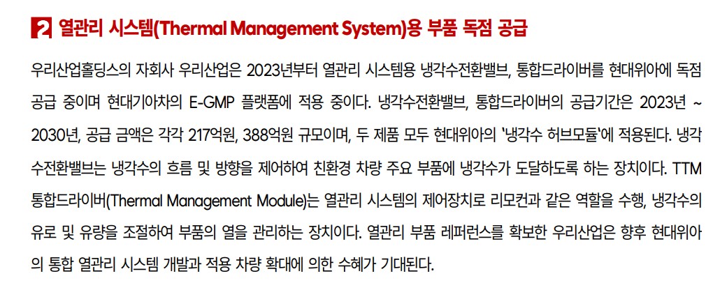 우리산업홀딩스는 글로벌 전기차 열관리 부품 전문 그룹사로, 투자 및 브랜드 수수료, 임대수익 등을 주된 수입원으로 하고 있음. 주요 사업 부문으로는 PTC 히터, 히터 컨트롤, HVAC 액츄에이터 등이 있으며, 다양한 해외 법인과 자회사를 통해 글로벌 시장에서 활약 중임. 본 글은 투자 권유글 아님. 모든 투자 책임은 본인에게 있음.