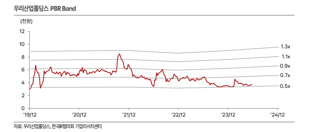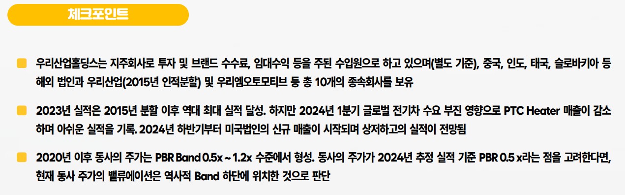 우리산업홀딩스는 2023년 실적이 2015년 분할 이후 역대 최대 실적을 달성했으나, 2024년 1분기 글로벌 전기차 수요 부진으로 PTC 히터 매출이 감소하며 아쉬운 실적을 기록했음. 하반기부터 미국법인의 신규 매출이 시작되며 상저하고의 실적이 전망됨. 2020년 이후 주가는 PBR Band 0.5x ~ 1.2x 수준에서 형성되었고, 현재 주가는 역사적 Band 하단에 위치하고 있음.