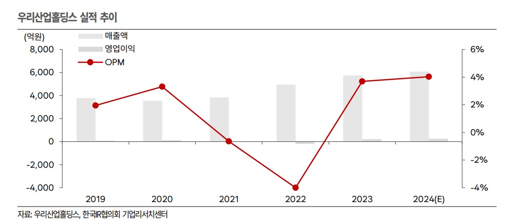 우리산업홀딩스의 재무 상황은 2023년 매출액 5,753억원, 영업이익 213억원을 기록하며 역대 최대 실적을 달성함. 부채비율은 2023년 기준 55.46%로 양호한 수준. 2024년 예상 매출액은 6,081억원, 영업이익은 245억원으로 전망됨.