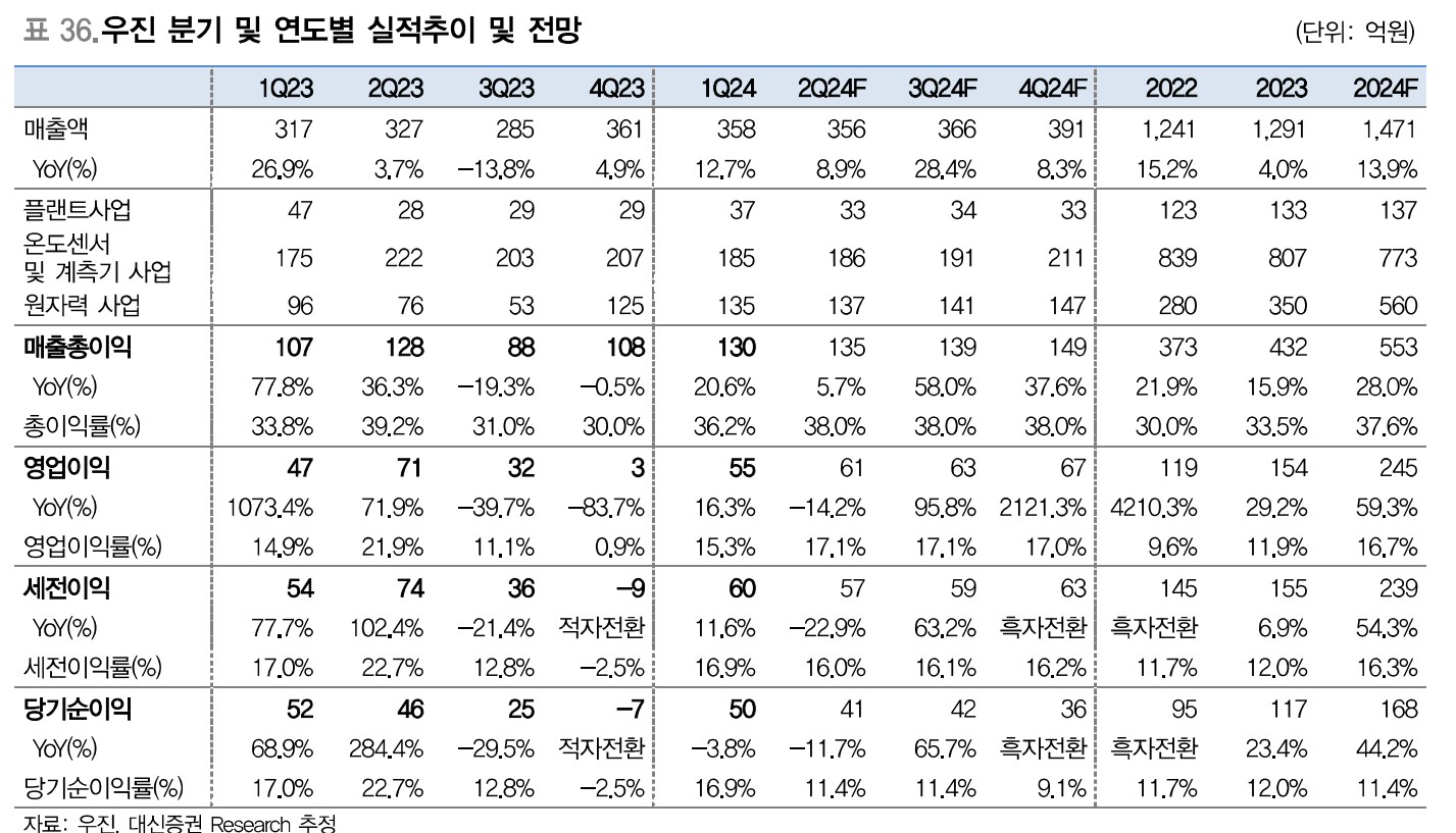 우진은 원자력 관련 기업으로, 최근 원자력 발전소 부품 공급 계약을 체결하며 주목받고 있음. 2024년 2분기 매출은 전년 동기 대비 증가할 것으로 예상되며, 영업이익도 안정적인 성장세를 보일 것으로 전망됨. 주요 성장 요인으로는 원자력 발전소 부품 수요 증가와 해외 시장 진출이 있음.
