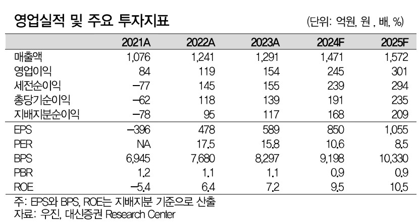 우진의 재무상황은 긍정적으로 평가됨. 매출액과 영업이익이 꾸준히 증가하고 있으며, 부채비율도 50% 이하로 안정적인 수준을 유지하고 있음. 아래 표에서 자세한 수치를 확인할 수 있음.