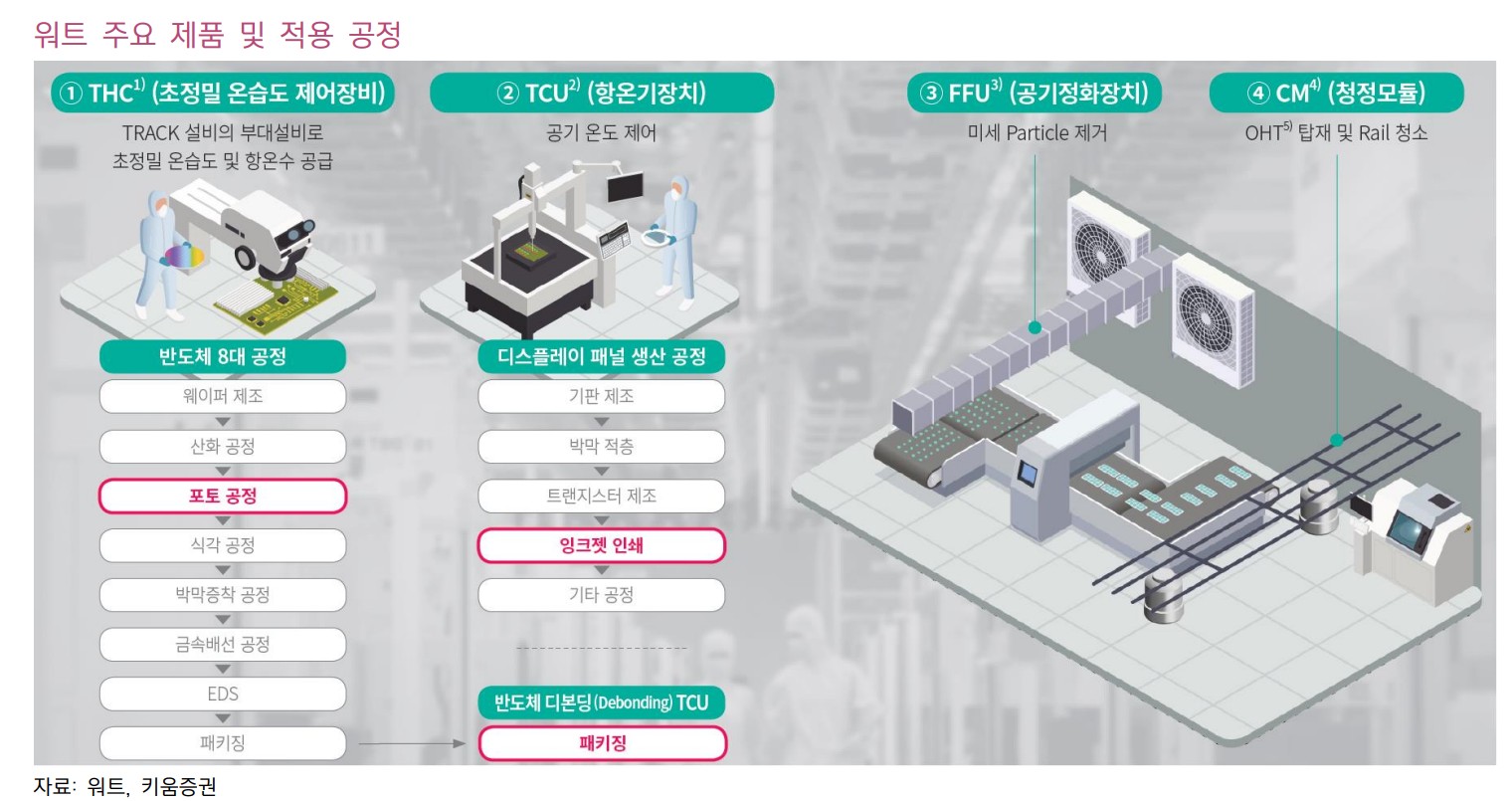 워트는 반도체 및 디스플레이 공정 환경 제어 설비를 제조하는 기업임. 주요 제품으로는 초정밀 온습도 제어 장비(THC), 공기 정화 장치(FFU), 항온기장치(TCU) 등이 있음. 하반기에는 반도체 및 디스플레이 고객사들의 투자 재개로 실적 반등이 기대됨. 특히 HBM 적층 공정 내 트랙 설비 사용으로 인한 THC 수요 증가가 예상됨.