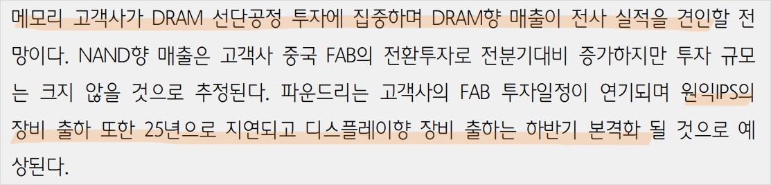 최근 원익IPS는 반도체 장비 시장에서의 성장이 주목받고 있음. 특히, 주요 고객사의 DRAM 선단공정 투자 확대와 NAND 전환투자가 가시화되면서 실적 개선이 기대됨. 또한, 디스플레이 장비 출하도 하반기에 본격화될 예정으로, 이로 인해 매출 증대가 예상됨. 파운드리 고객사의 FAB 투자 일정이 연기되었지만, 2025년부터는 장비 출하가 재개될 전망임.