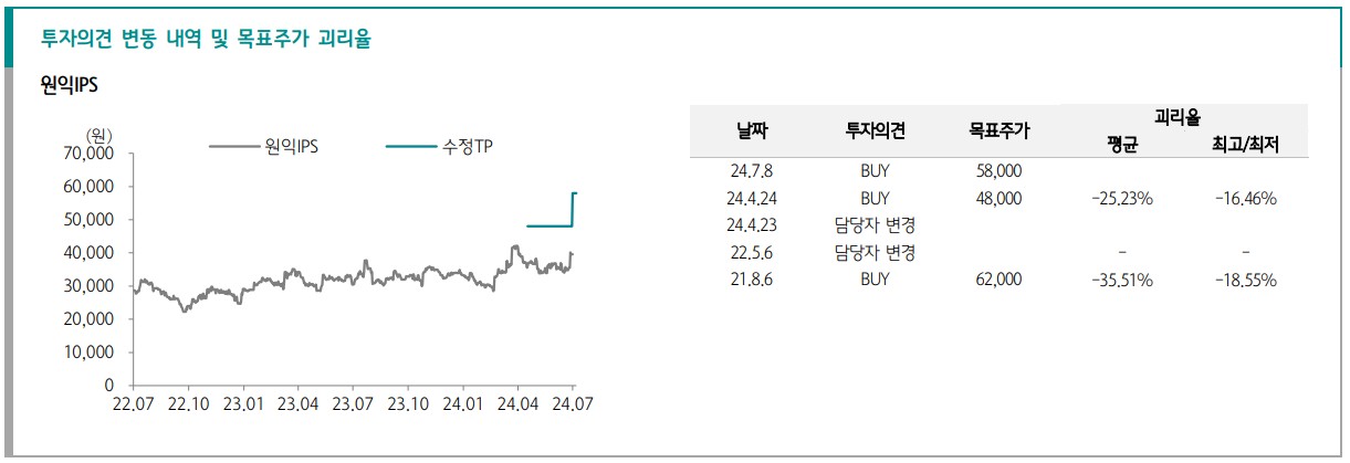 원익IPS의 목표주가는 58,000원임. 이는 현재 주가 대비 46% 상승 여력이 있음. 매수 의견을 유지함.