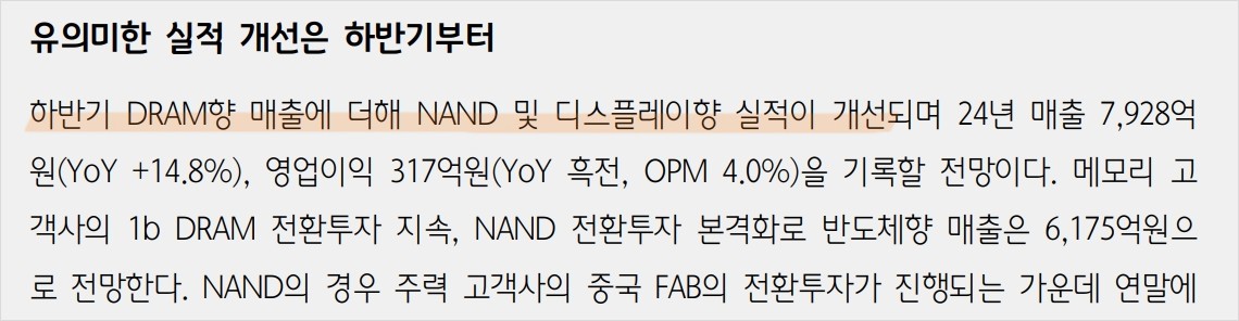 원익IPS는 현재 주가 39,600원으로 목표주가는 58,000원임. 하반기 실적 개선 기대가 큼. 올해 매출액은 7,928억원, 영업이익은 317억원으로 예상됨. 원익IPS는 반도체 및 디스플레이 매출 증가가 예상됨. 주요 고객사의 DRAM 투자 확대가 실적에 긍정적 영향을 줄 전망임.