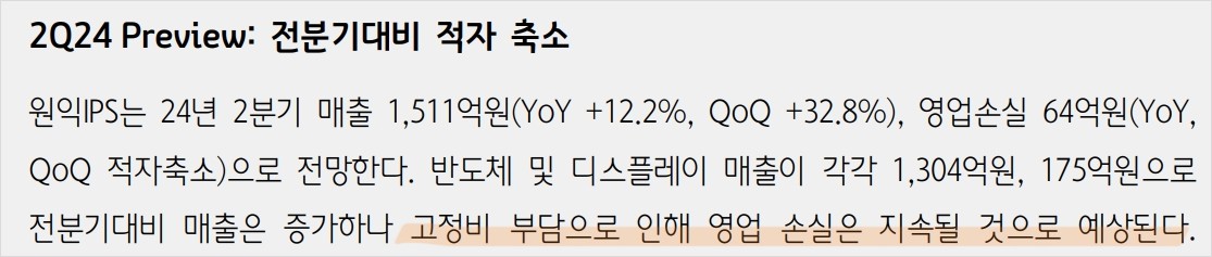 A. 원익IPS는 2분기 실적에서 전분기 대비 적자를 축소했으며, 매출액은 1,511억원, 영업손실은 64억원으로 예상됨. 반도체 및 디스플레이 매출이 모두 증가하여 하반기 실적 개선이 기대됨.
