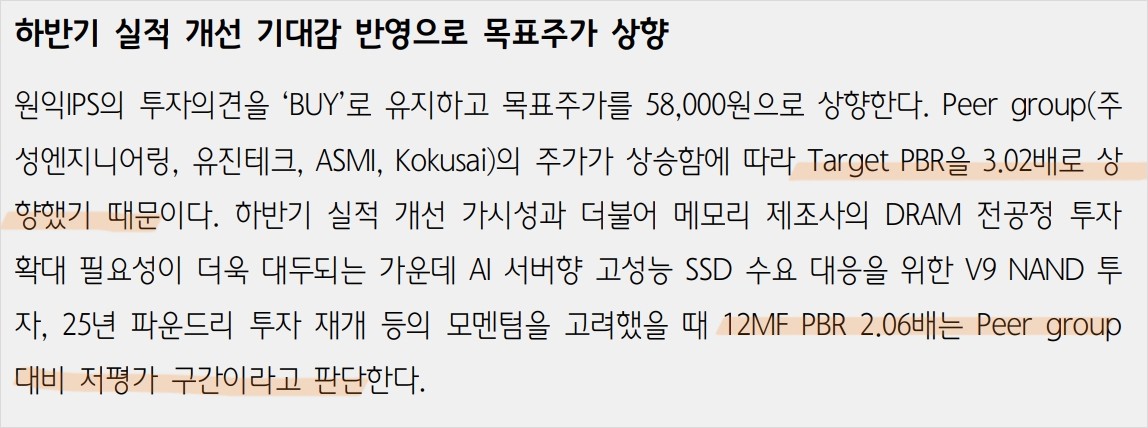 원익IPS는 현재 주가 39,600원으로 목표주가는 58,000원임. 하반기 실적 개선 기대가 큼. 올해 매출액은 7,928억원, 영업이익은 317억원으로 예상됨. 원익IPS는 반도체 및 디스플레이 매출 증가가 예상됨. 주요 고객사의 DRAM 투자 확대가 실적에 긍정적 영향을 줄 전망임.