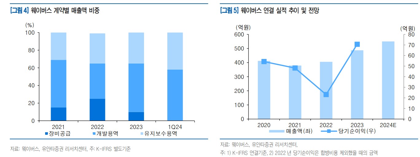 웨이버스는 2023년 매출액 488억원, 영업이익 51억원을 기록했음. 영업이익률은 10.4%로 안정적인 수익성을 유지하고 있으며, 순이익은 71억원임. 부채비율은 39.9%로 안정적인 수준을 유지하고 있으며, PER은 11.5배로 적정 수준임. 아래 표는 2021년부터 2024년 1분기까지의 주요 재무 지표를 나타냄.