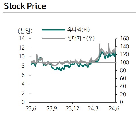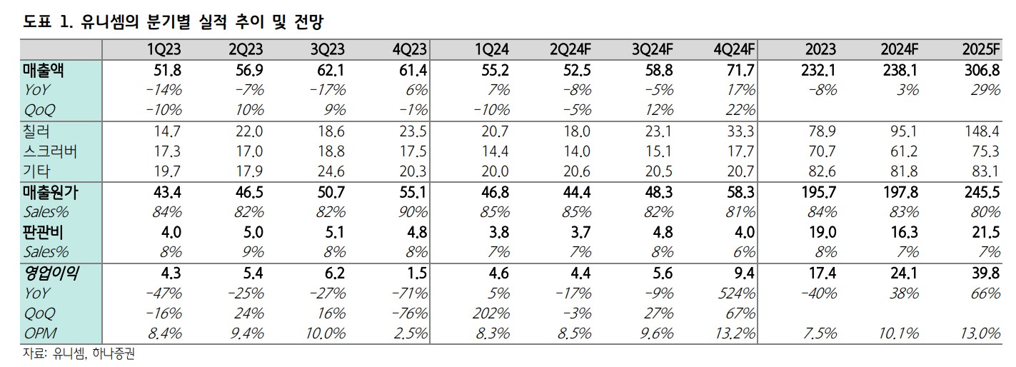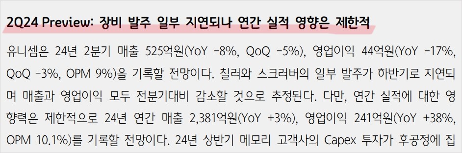 유니셈은 최근 몇 가지 주요 이슈가 있음. 첫째, 2024년 2분기 매출은 525억원으로 전년 동기 대비 8%, 전분기 대비 5% 감소할 것으로 예상됨. 이는 칠러와 스크러버의 일부 발주가 하반기로 지연된 영향임. 둘째, 연간 실적에는 큰 영향을 미치지 않을 것으로 보이며, 2024년 연간 매출은 2,381억원, 영업이익은 241억원으로 각각 전년 대비 3%, 38% 증가할 전망임. 셋째, 극저온 칠러와 친환경 스크러버의 수요 증가로 중장기 성장 가능성이 높아지고 있음.
