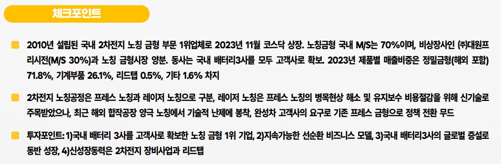 유진테크놀로지는 2010년에 설립된 국내 2차전지 노칭 금형 부문 1위 업체로, 2023년 11월에 코스닥에 상장되었습니다. 이 회사는 국내 배터리 3사를 모두 고객사로 확보하고 있으며, 노칭 금형 국내 시장 점유율의 70%를 차지하고 있습니다. 유진테크놀로지는 정밀 금형, 기계 부품, 리드탭 등 다양한 제품을 제조하며, 2023년 매출 비중은 정밀 금형 71.8%, 기계 부품 26.1%, 리드탭 0.5%, 기타 1.6%로 구성되어 있습니다.