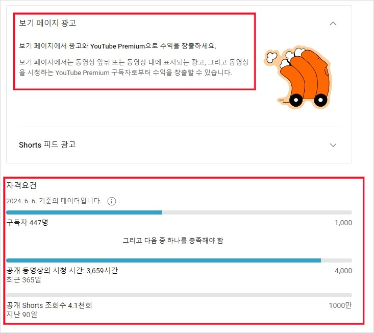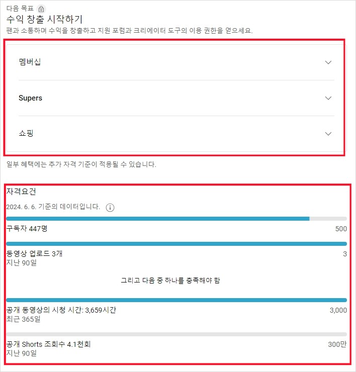 - 공개 동영상 시청 시간 4000시간 이상 or 공개 쇼츠 조회시간 1000만시간