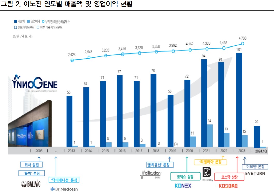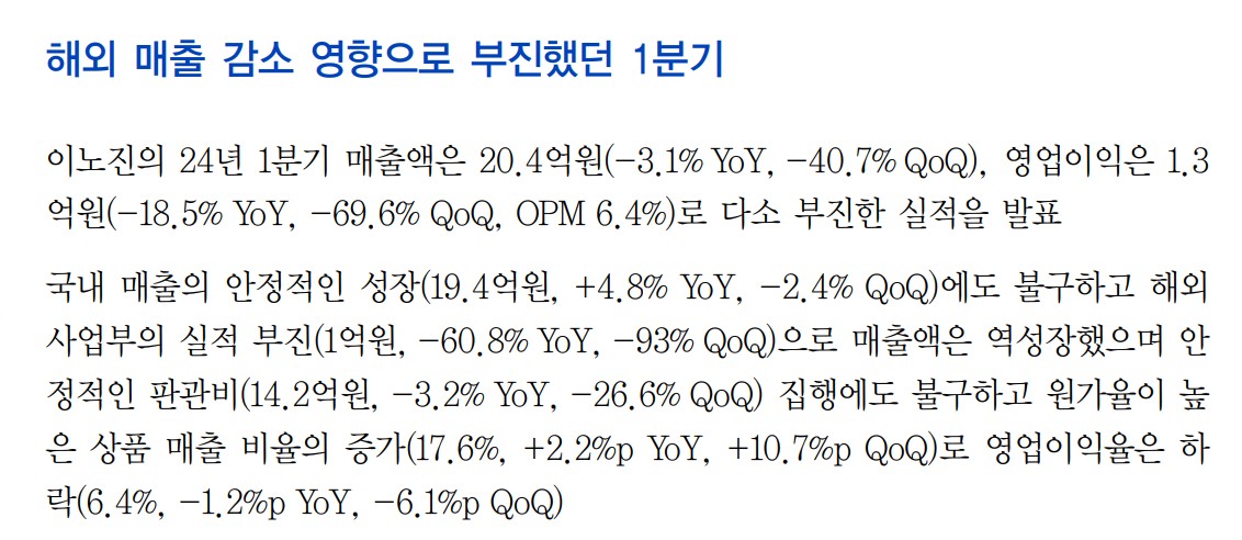 이노진은 24년 1분기 매출액 20.4억원, 영업이익 1.3억원을 기록하며 다소 부진한 실적을 발표함. 국내 매출은 19.4억원으로 안정적인 성장을 보였으나, 해외 매출이 1억원으로 크게 감소했음. 해외 매출 정상화가 중요한 관전 포인트. 하반기에는 해외 병원 입점 및 홈쇼핑 진출로 해외 매출이 회복될 것으로 기대됨. 22개국 글로벌 네트워크를 기반으로 해외 시장에서의 성장 가능성이 큼.