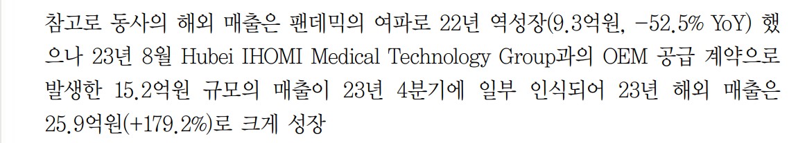 이노진은 최근 해외 매출 정상화와 제품 매출 비율 증가를 주시하고 있음. 2023년 해외 매출은 25.9억원으로 크게 성장. Hubei IHOMI Medical Technology Group과의 OEM 공급 계약을 통해 매출이 증가했으며, 해외 병원 입점 및 홈쇼핑 진출로 해외 인지도를 확장 중임. 2024년 하반기에는 해외 매출 정상화가 기대됨.