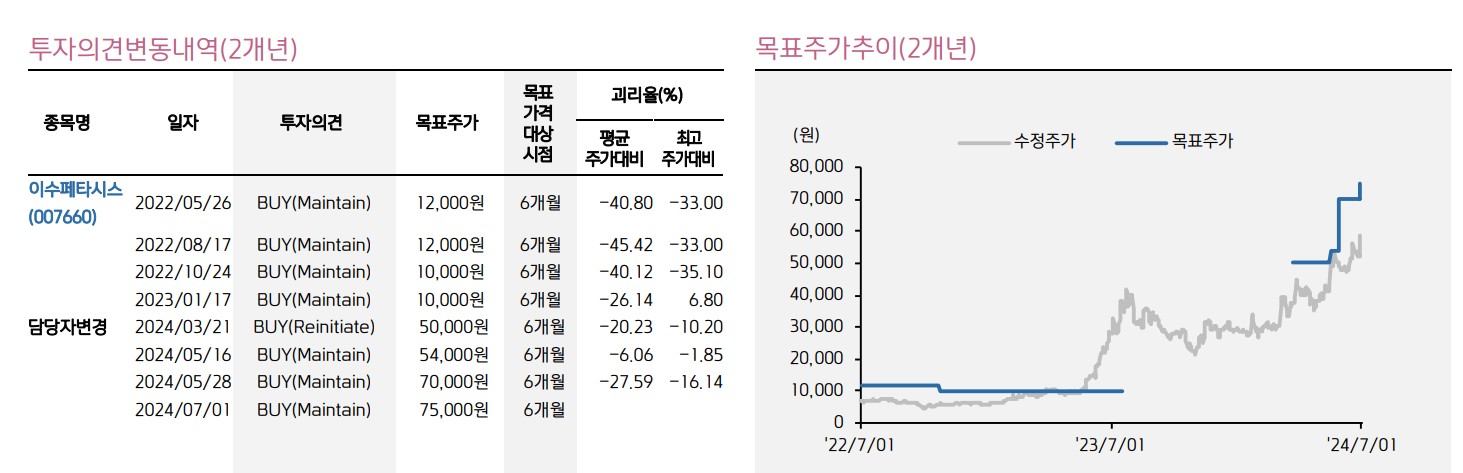 이수페타시스의 목표주가는 75,000원으로 설정됨. 이는 현재 주가 대비 상승 여력을 의미함. 이수페타시스의 지속적인 성장 가능성을 반영한 목표주가임.