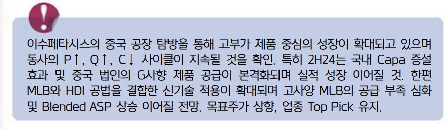 이수페타시스는 최근 중국 공장 탐방을 통해 고부가 제품 중심의 성장을 확인했음. 특히, 2024년 하반기부터 국내 생산 능력(Capa) 증설과 중국 법인의 G사향 제품 공급이 본격화될 것으로 전망됨. MLB와 HDI 공법을 결합한 신기술 적용 확대와 함께 고사양 MLB의 공급 부족이 심화되며 Blended ASP 상승이 이어질 것으로 보임. 목표주가 상향, 업종 Top Pick 유지.
