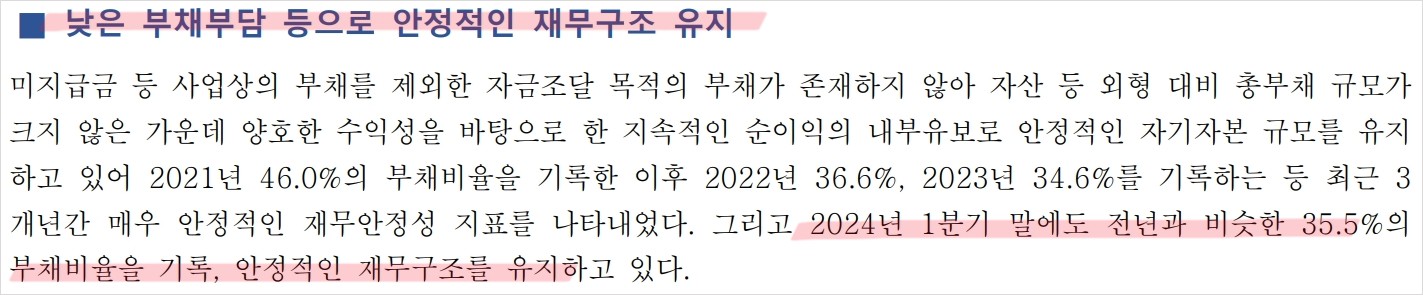 | 부채비율 | 46.0% | 36.6% | 34.6% | - |