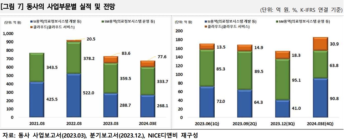 이지케어텍은 의료정보시스템 시장에서 강력한 입지를 가지고 있으며, AI와 클라우드 솔루션을 통한 혁신적인 서비스를 제공하고 있음. 클라우드 기반 HIS 솔루션의 수요 증가와 AI 기반 폐 질환 진단 소프트웨어의 상용화가 기대됨. 2024년에도 안정적인 성장세가 예상됨.