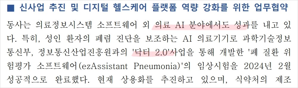 이지케어텍은 최근 AI 기반 폐 질환 진단 소프트웨어 'ezAssistant Pneumonia'의 상용화를 추진하고 있음. 폐렴 진단 정확도 91.5%를 기록하며 임상시험을 성공적으로 마침. 디지털 헬스케어 플랫폼 강화를 위해 엘스비어, KT와의 협력을 통해 다양한 프로젝트를 진행 중. 2024년에는 클라우드 기반의 HIS 솔루션 수요 증가가 예상됨.
