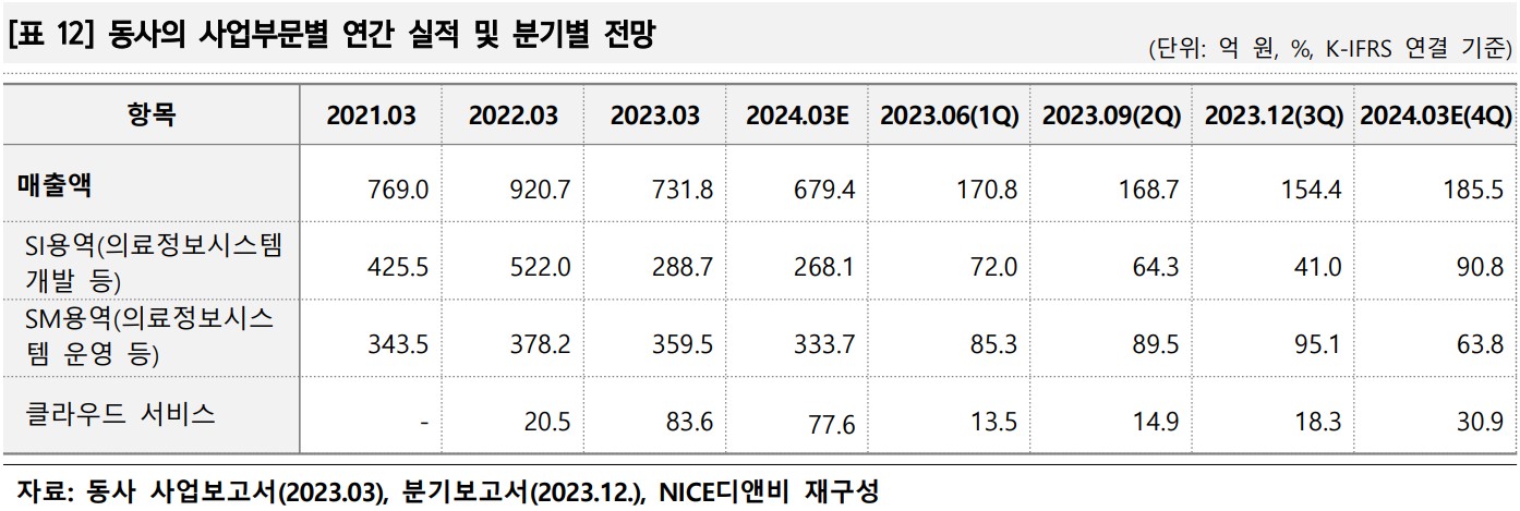 이지케어텍은 의료정보시스템 시장에서 강력한 입지를 가지고 있으며, AI와 클라우드 솔루션을 통한 혁신적인 서비스를 제공하고 있음. 클라우드 기반 HIS 솔루션의 수요 증가와 AI 기반 폐 질환 진단 소프트웨어의 상용화가 기대됨. 2024년에도 안정적인 성장세가 예상됨.