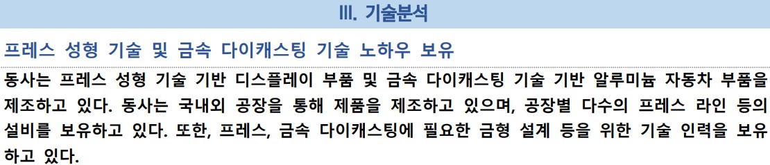 - 기술적 분석: 프레스 성형 및 금속 다이캐스팅 기술 보유