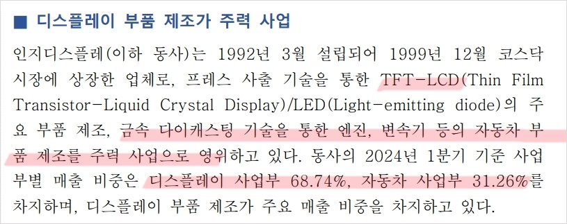 인지디스플레이는 1992년에 설립된 디스플레이 및 자동차 부품 제조 전문 기업임. 주력 사업은 디스플레이 부품 제조와 자동차 부품 제조로, 특히 TFT-LCD와 LED 디스플레이 부품에서 강점을 보임. 최근 주요 매출처는 삼성전자와 삼성디스플레이로, 2024년 1분기 매출액은 1,787.9억 원을 기록하였음.