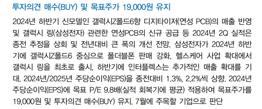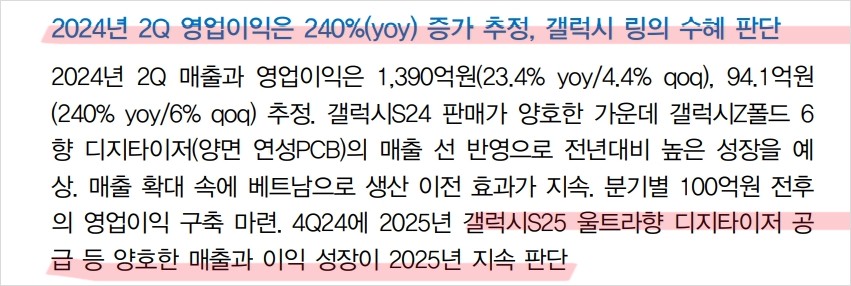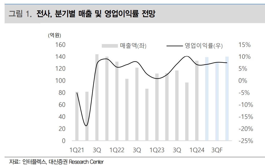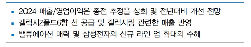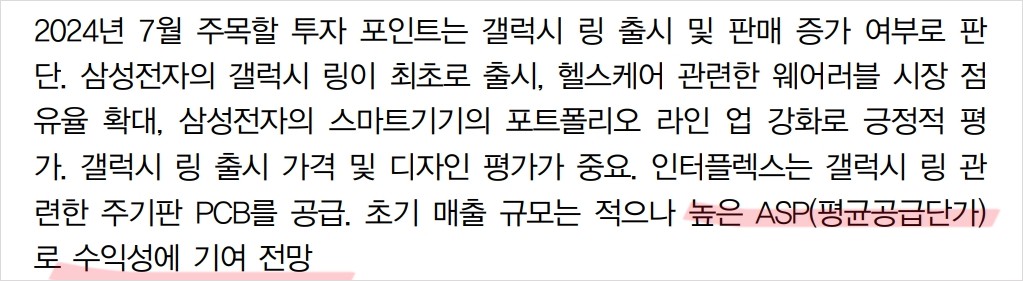인터플렉스는 최근 삼성전자의 갤럭시Z폴드6와 갤럭시 링 출시와 관련한 매출이 증가하고 있음. 특히, 갤럭시 링의 헬스케어 관련 웨어러블 시장 진출로 인해 수익성 개선이 기대됨. 하반기에도 삼성전자의 신제품 출시와 함께 매출 성장이 지속될 것으로 예상됨.
