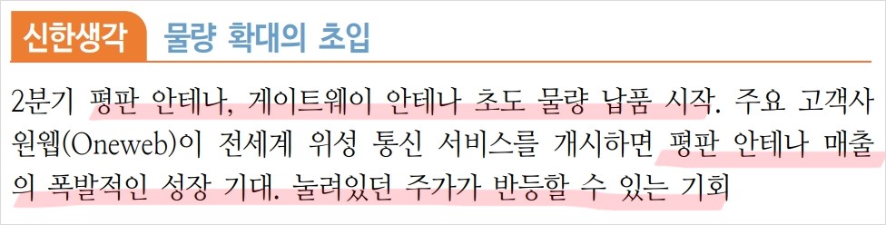 - 게이트웨이 안테나 부문에서도 새로운 성장 동력이 기대됨.