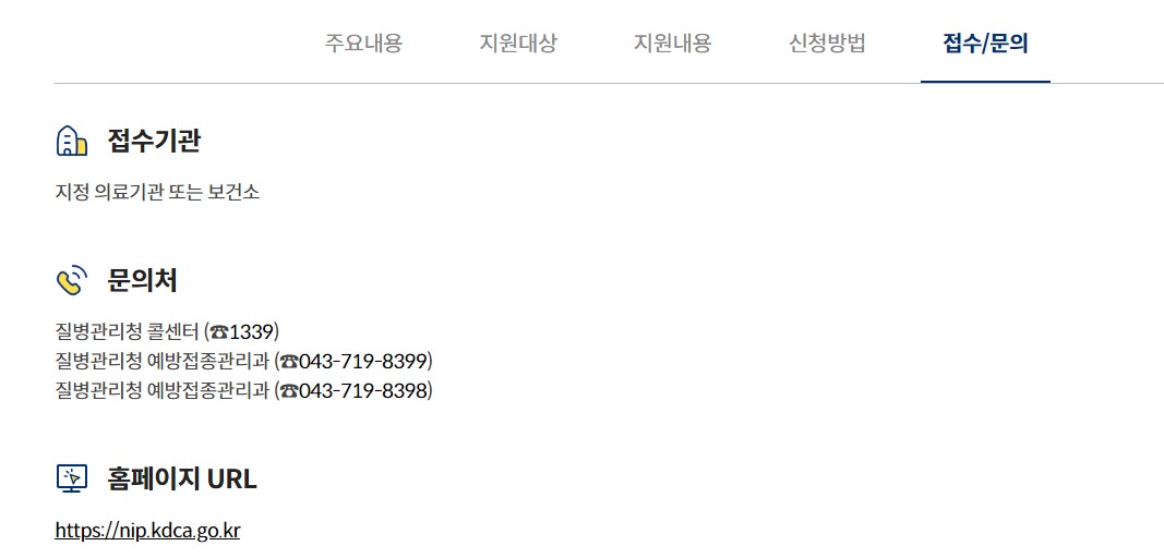 • 문의처: 질병관리청 콜센터 (☎1339), 질병관리청 예방접종관리과 (☎043-719-8399, ☎043-719-8398)