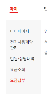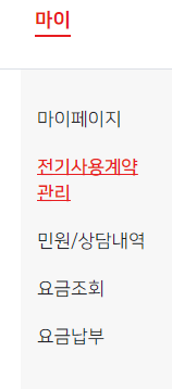 1. 사이트 상단에 보면 마이 라는 메뉴가 있습니다. 마이 >> 전기사용계약관리로 가줍니다.