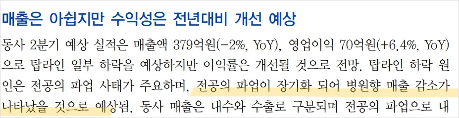 제이브이엠의 2024년 2분기 예상 실적은 매출액 379억원으로 전년 대비 2% 감소할 것으로 예상됨. 그러나 영업이익은 70억원으로 전년 대비 6.4% 증가할 전망임. 주요 원인은 전공의 파업으로 인한 병원향 매출 감소이지만, 수익성은 개선될 것으로 보임. 전공의 파업이 하반기에는 마무리될 것으로 예상되며, 이에 따라 하반기 매출이 다시 회복될 가능성이 있음.