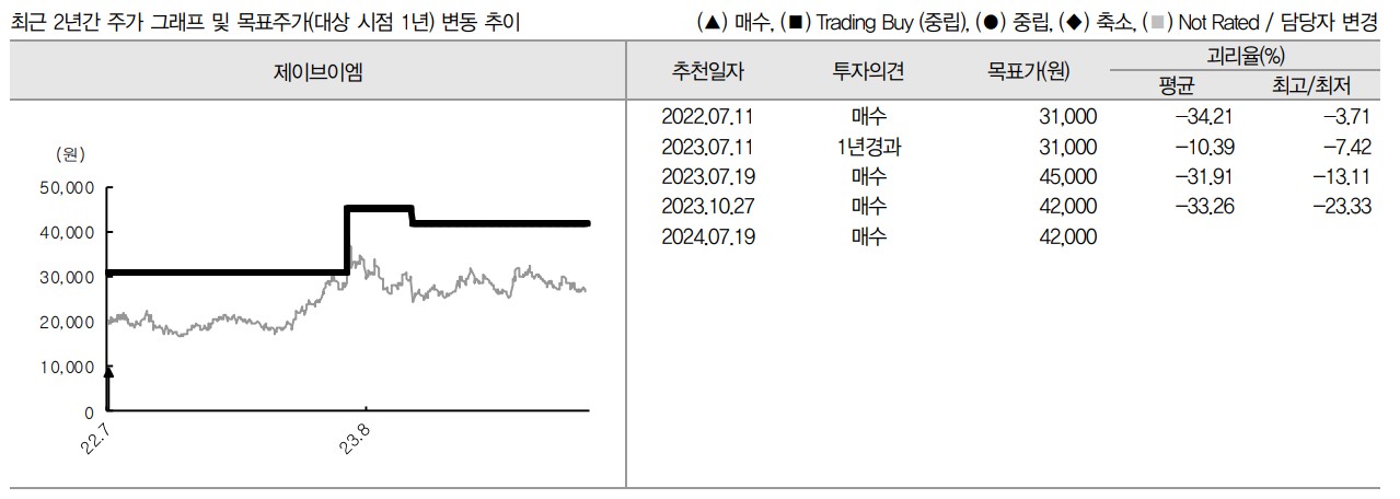제이브이엠은 전반적으로 긍정적인 실적을 보이고 있으며, 일부 부문의 부진에도 불구하고 하반기에는 개선이 예상됨. 자동화 시스템 부문의 성장이 주가 상승의 중요한 변수로 작용할 것으로 보임. 목표주가는 42,000원으로 설정되었으며, 이는 현재 주가 대비 약 36%의 상승 여력을 나타냄. 제이브이엠의 지속적인 성장을 기대하며, 투자자들은 이 기업의 향후 실적을 주목할 필요가 있음.