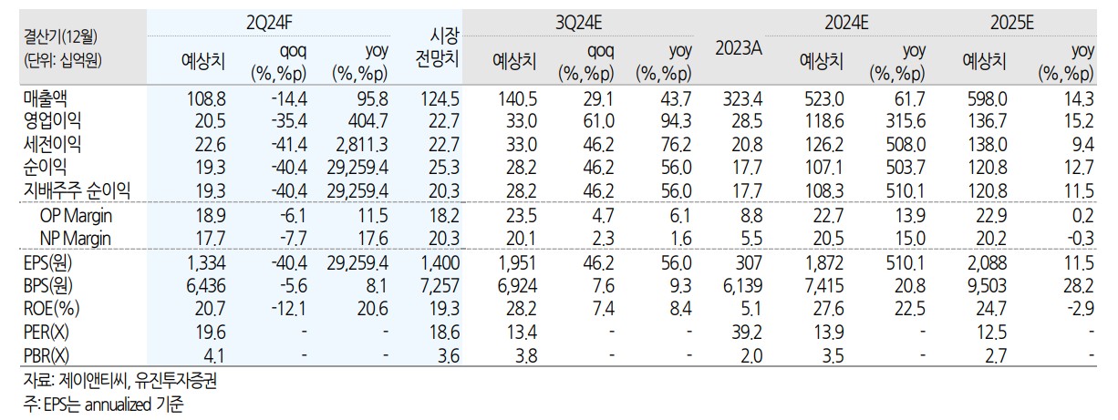 제이앤티씨의 2023년 매출액은 3,234억원, 영업이익은 285억원을 기록함. 2024년과 2025년에는 각각 매출액 5,230억원, 5,980억원과 영업이익 1,186억원, 1,367억원을 달성할 것으로 예상됨. 부채비율은 2023년 45.9%에서 2024년 37.7%, 2025년 32.0%로 감소할 전망. PER은 2023년 13.9배에서 2024년 12.5배로 개선될 것으로 보임.