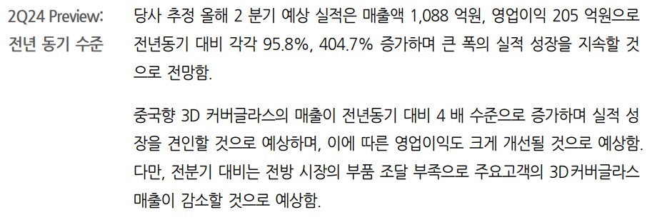 - 자동차용 강화유리 매출은 하반기부터 실적 성장이 예상됨.